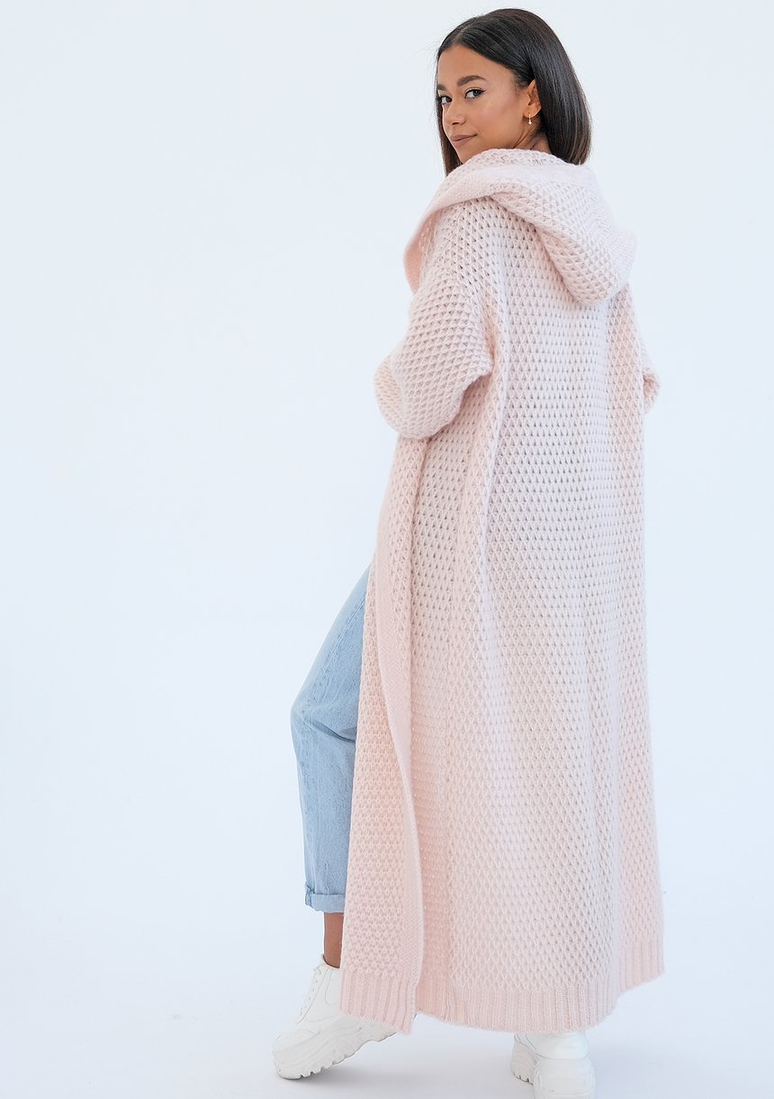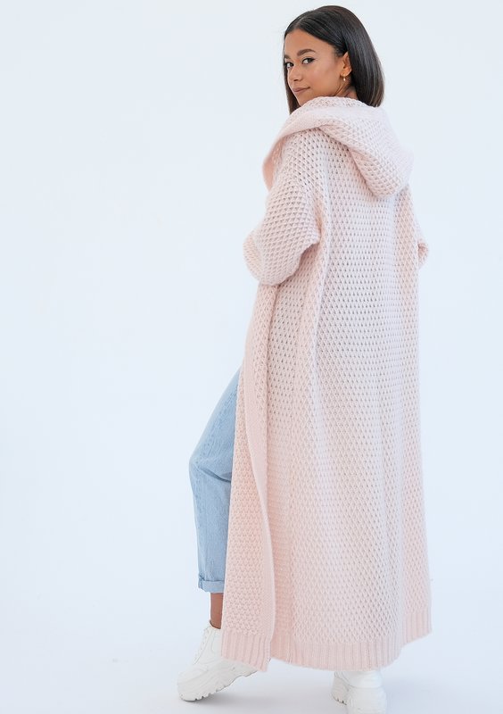 Długi kardigan z wygodnym kapturem zachwyca wyrazistym splotem i kobiecym, pudrowym odcieniem różu. Miękko otuli Twoje ciało ciepłą dzianiną z wełną. Dzięki uniwersalnemu stylowi nadaje się do wielu codziennych zestawień.