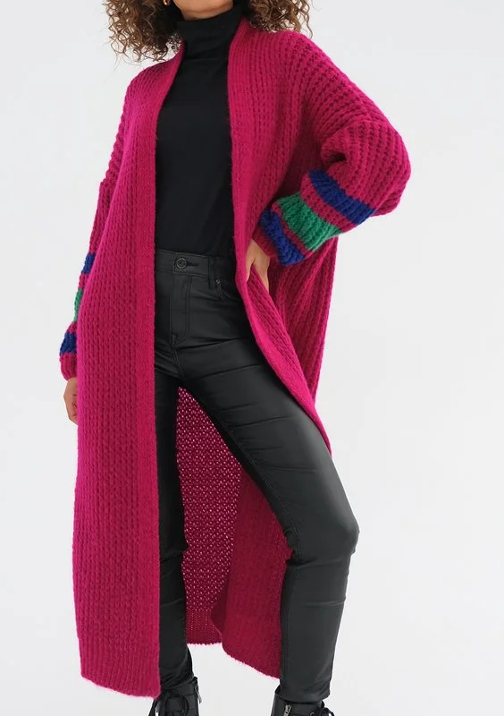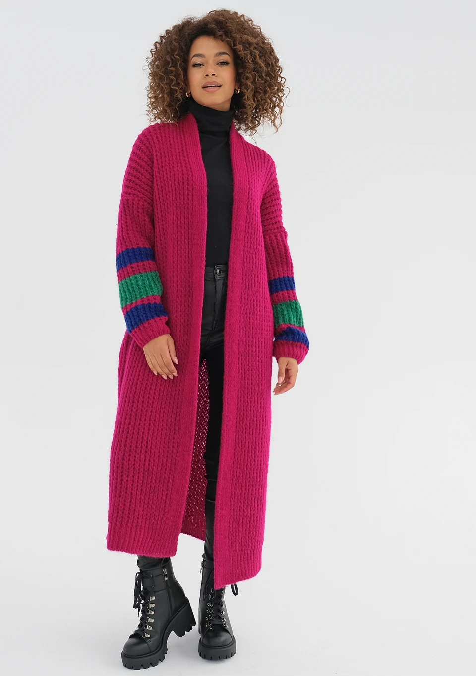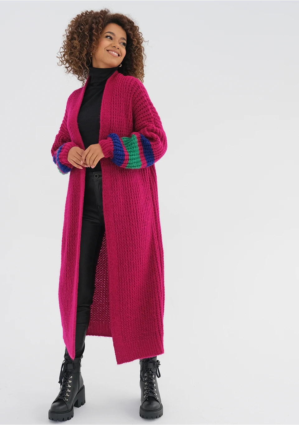 Długi kardigan to damski jest przyjemnie miękki i ciepły, a w dodatku pasuje do różnych kombinacji. To sweter damski w wyrazistej fuksji, z kolorowymi paskami na rękawach.