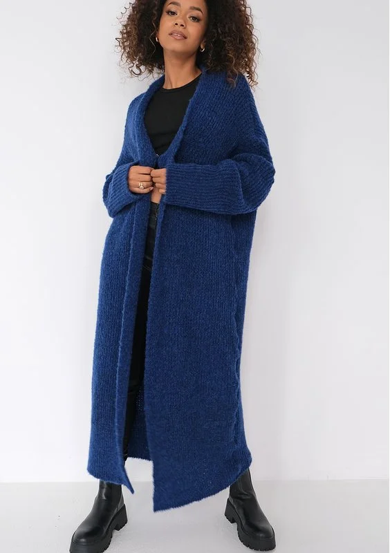Długi, niebieski kardigan damski wykonany z miękkiej dzianiny z dodatkiem wełny. Przyjemnie osłania całą sylwetkę.