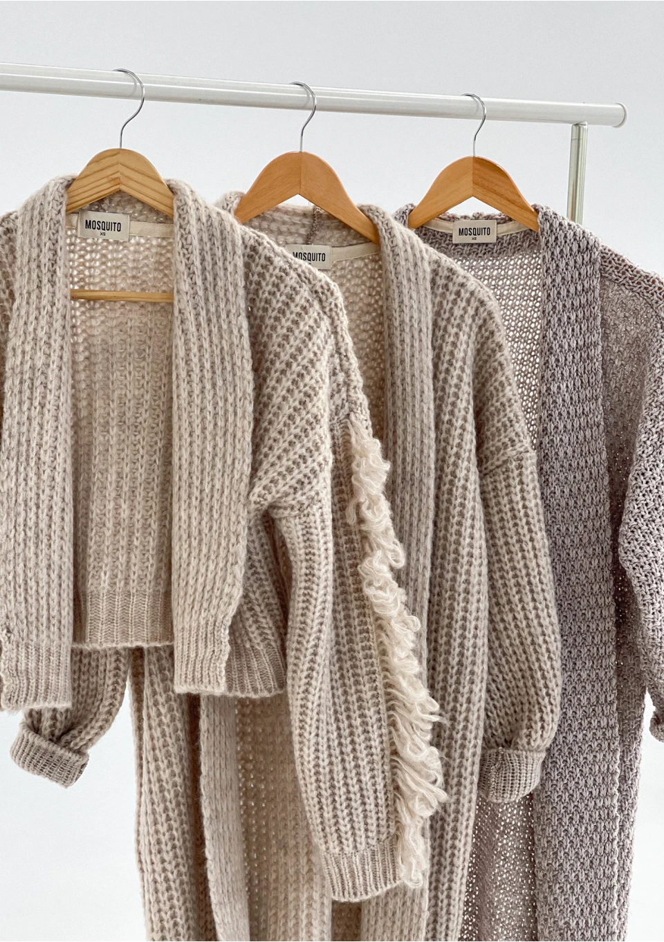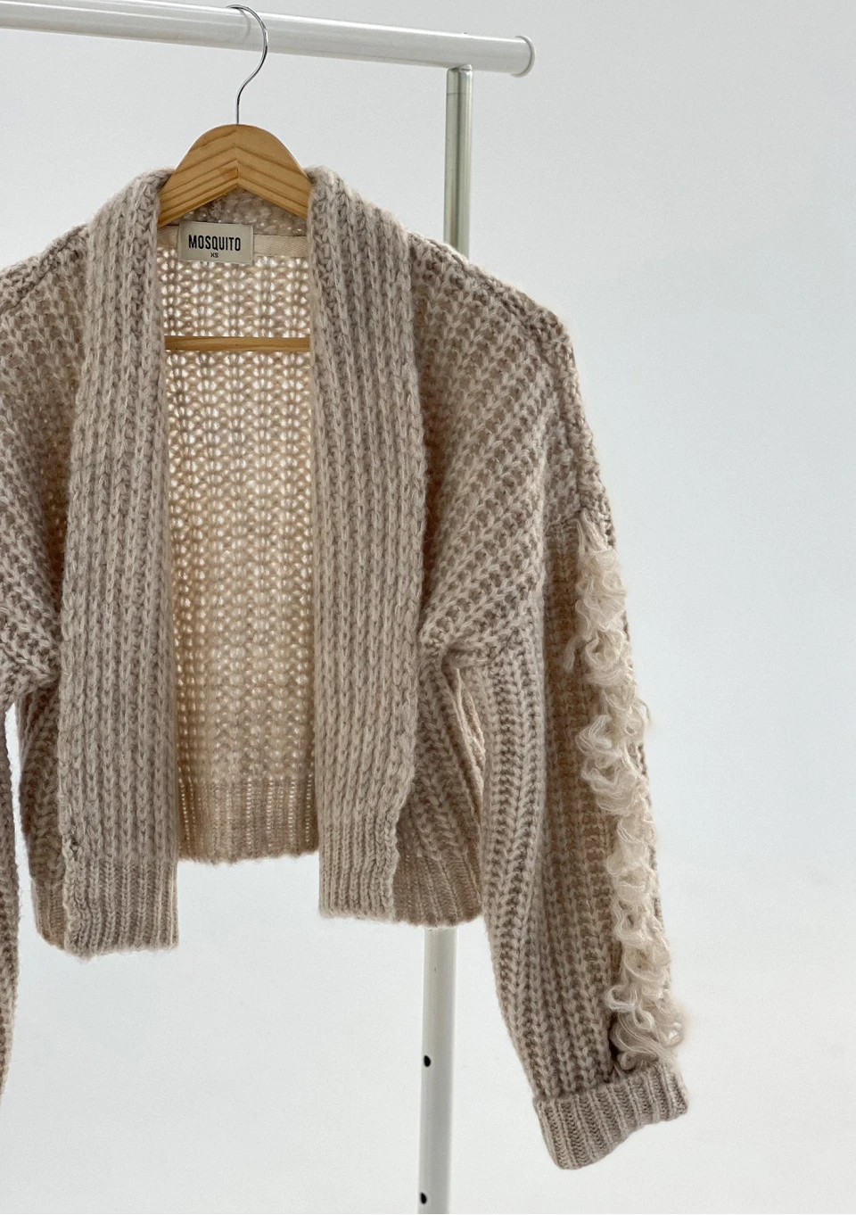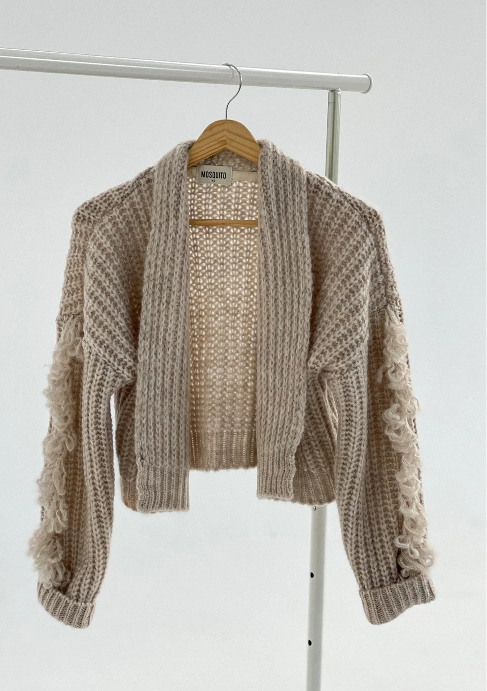 Subtelny, beżowy sweter damski to model z miękkiej i bardzo ciepłej dzianiny z dodatkiem wełny. Zachwyca niebanalną ozdobą frędzli wzdłuż rękawów, które nadają uroczego stylu.