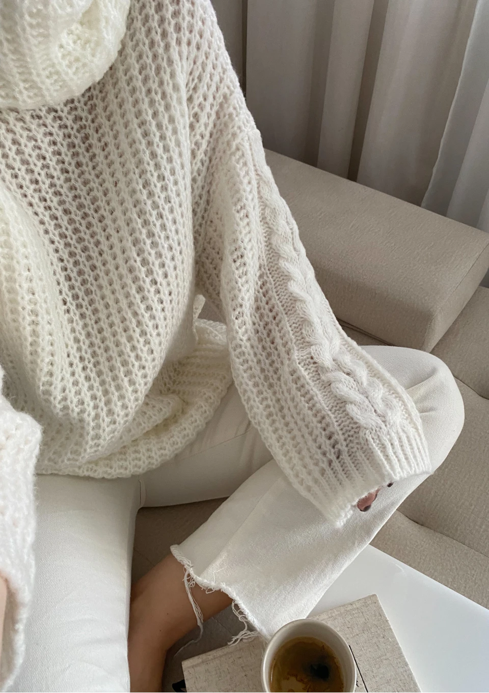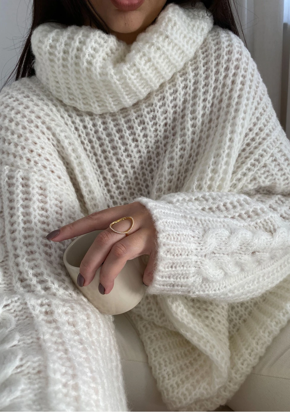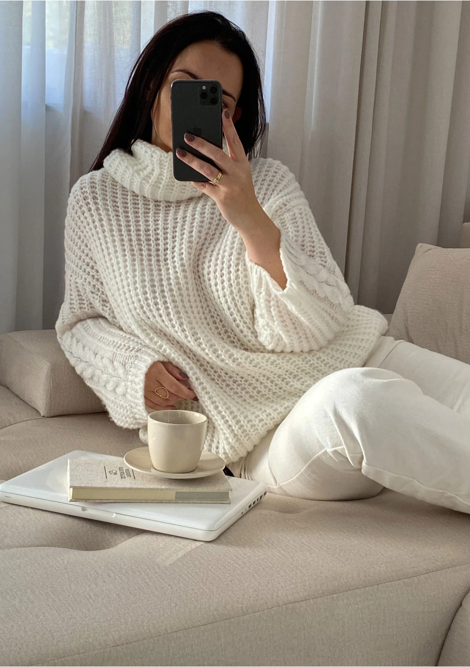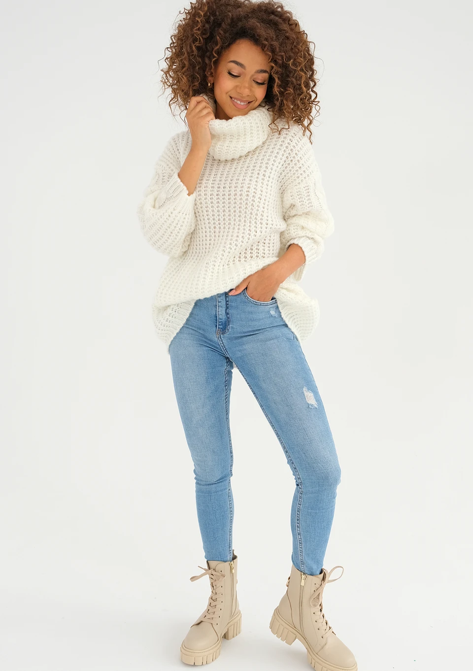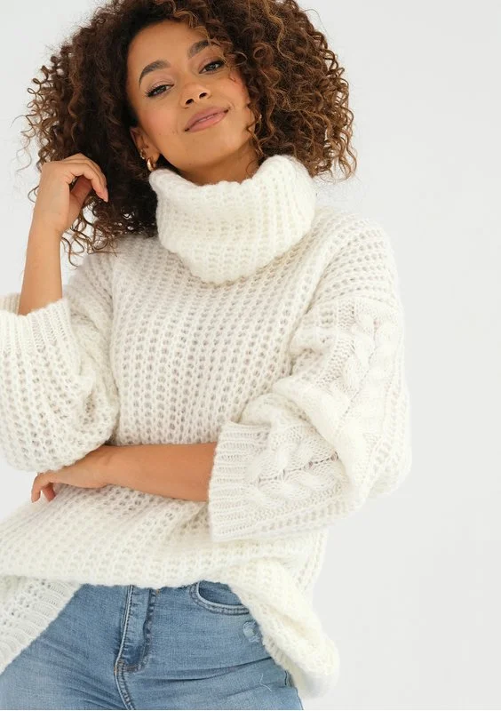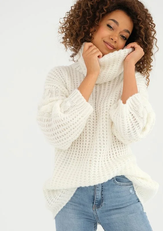 Zadbaj o miękkie otulenie w chłodne dni. W tym celu idealne sprawdzi się ciepły golf damski z wełną. Sweter posiada wygodny, bardzo luźny fason i jest ozdobiony pięknymi kłosami.