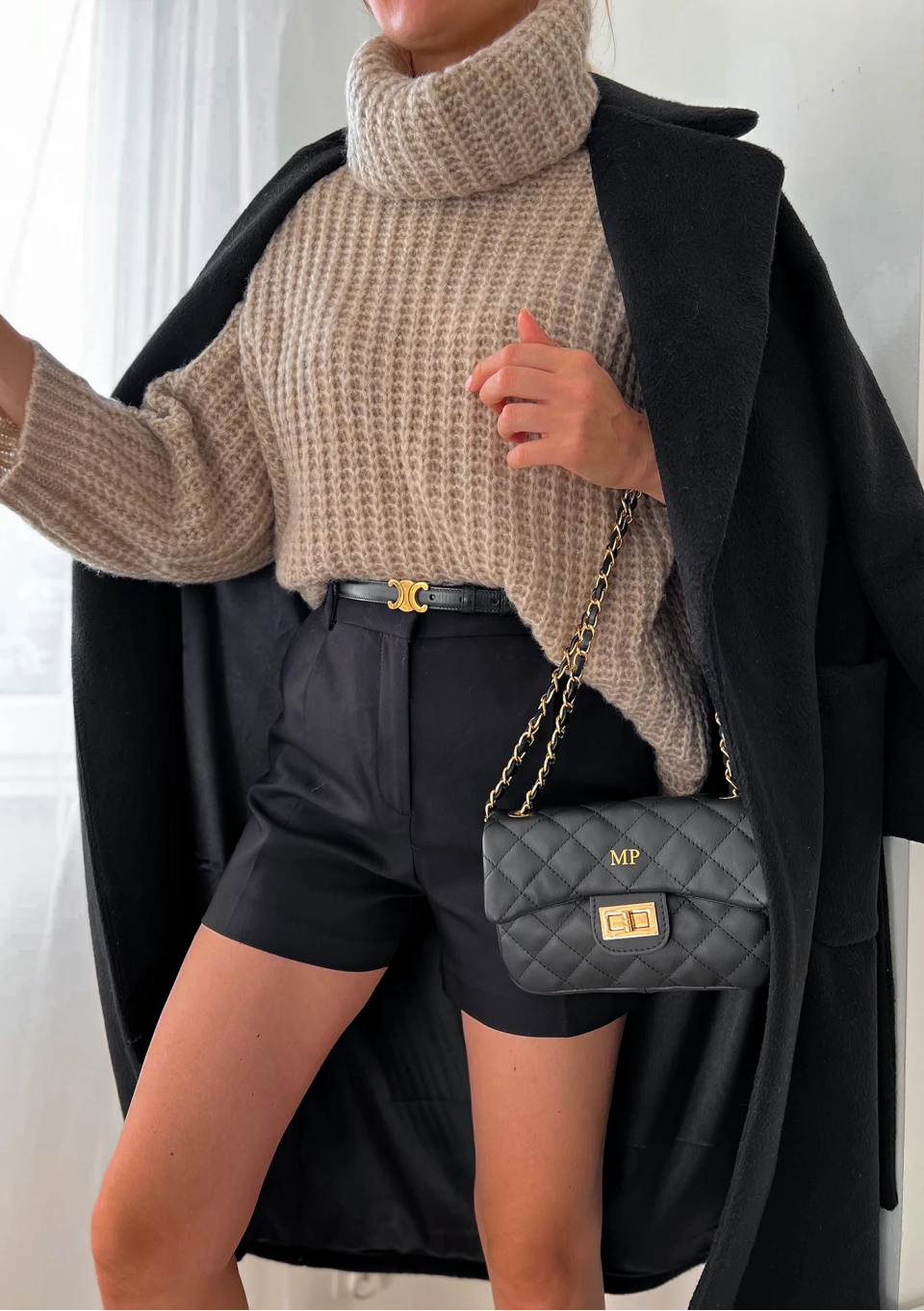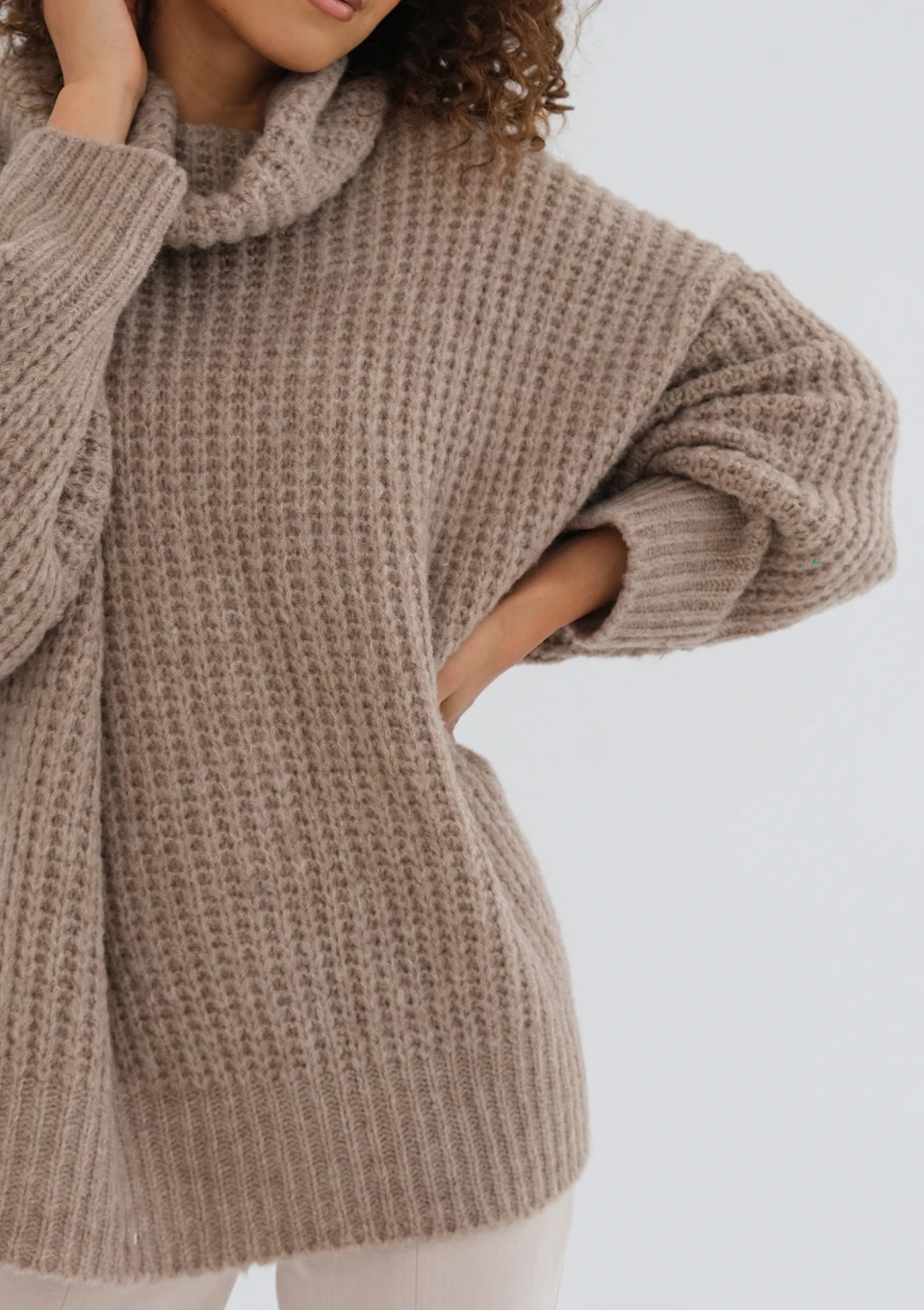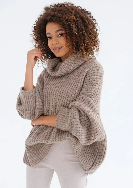 Golf damski oversize w ponadczasowym stylu zapewni Ci miękkie otulenie w chłodne dni. Wykonany z ciepłej dzianiny z dodatkiem wełny, w uniwersalnym beżu latte.