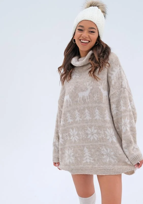 Wygodny sweter oversize z nastrojowym, zimowym wzorem. Wykonany z optymalnie ciepłej dzianiny w beżowym kolorze.