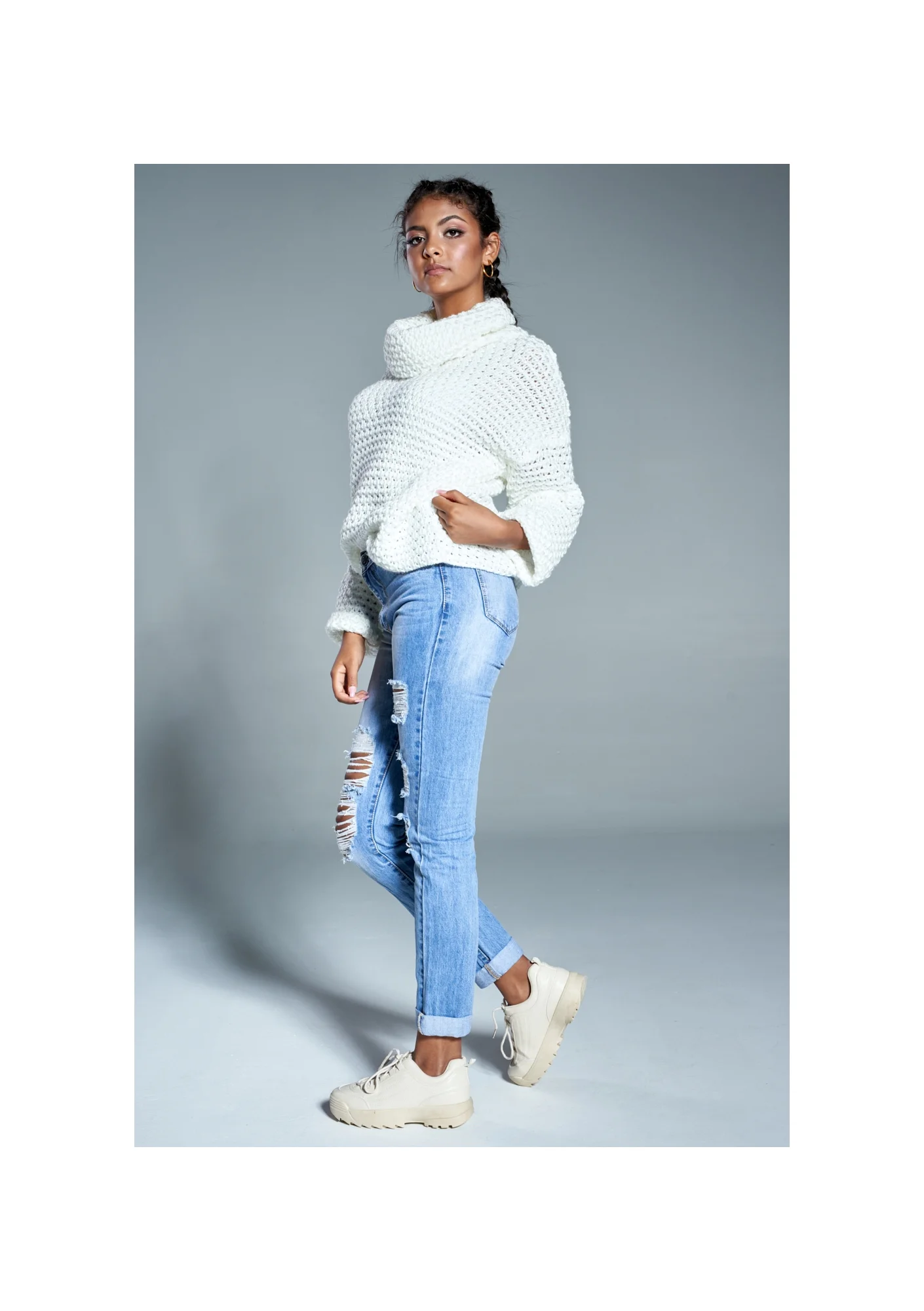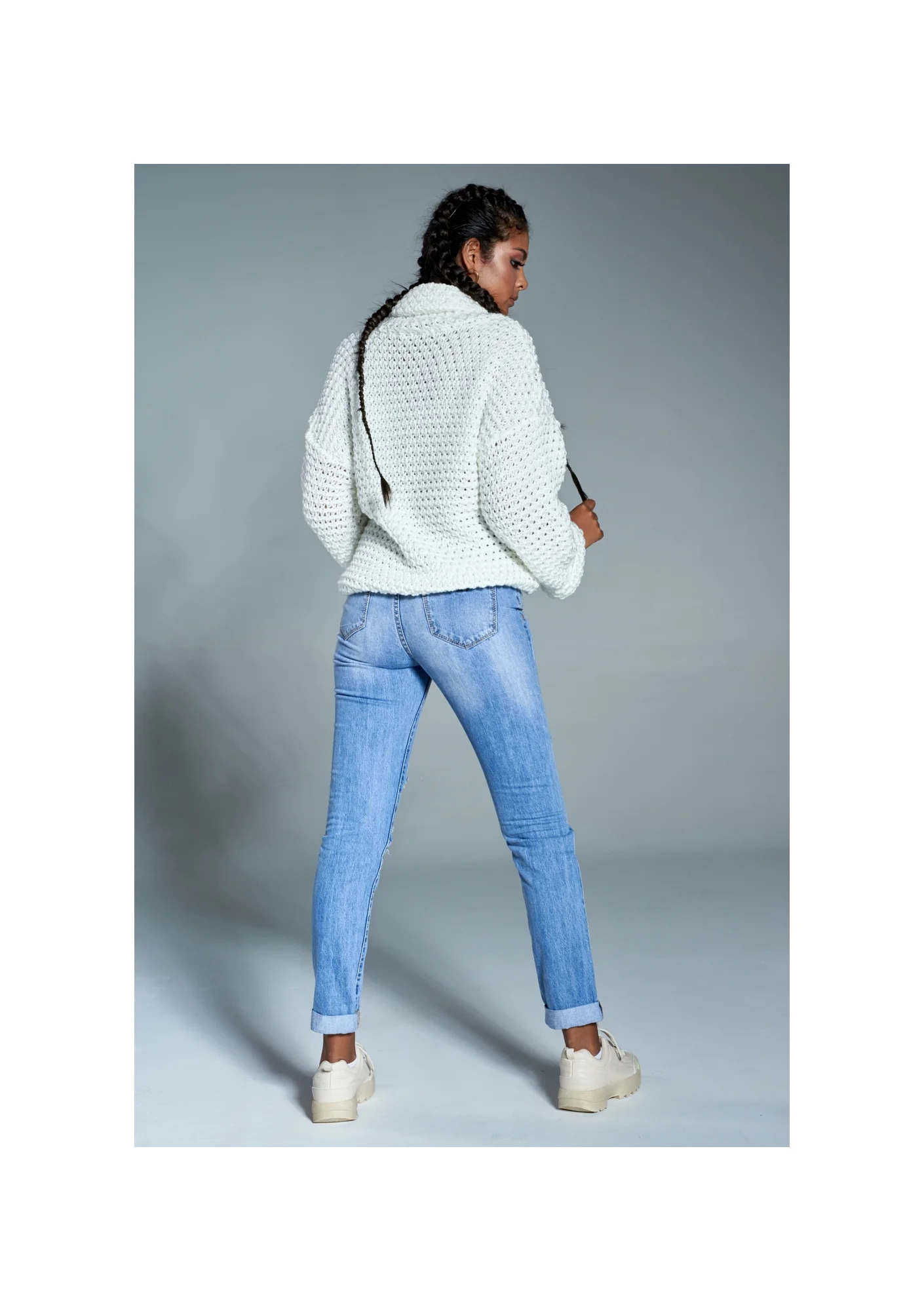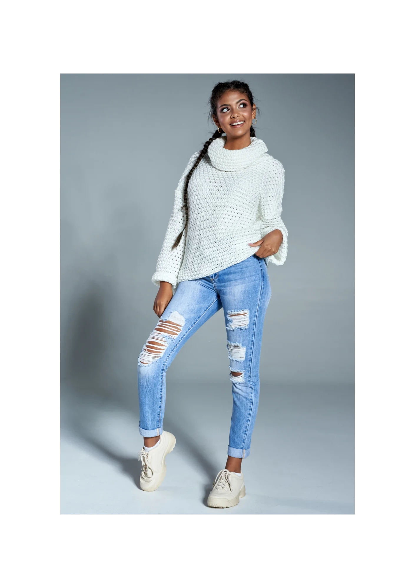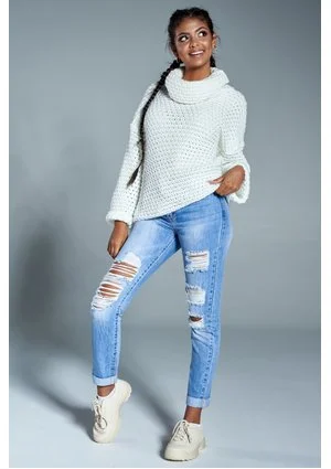 Już dziś podkreśl charakter swoich codziennych stylizacji za pomocą prezentowanego swetra. Jego oversizowy krój sprawia, że sweter można nosić na kilka różnych sposobów. Zarówno luźno i na sportowo, jak i wykorzystując go do stworzenia eleganckiej stylizacji, np. łącząc go z czarnymi rurkami i butami na obcasie. Możliwości jest wiele, dlatego jest to zdecydowanie must have każdej kobiety, która pragnie wyglądać modnie i stylowo każdego dnia. Kremowy kolor doskonale podkreśla każdą karnację i tym samym jest niezwykle uniwersalny. Wkładany przez głowę sweter z domieszką wełny i z golfem zapewnia Ci ciepło podczas chłodnych, wietrznych dni. Ponadto dzianina jest niezwykle przyjemna i miła w dotyku. Grubsze oczka widoczne w splocie podkreślają jego charakter, a luźniejsze rękawy gwarantują wygodę na co dzień. Już dziś postaw na najwyższą jakość ubrań i niebanalny styl - sprawdź nasze swetry damskie!