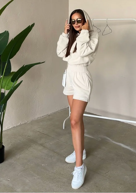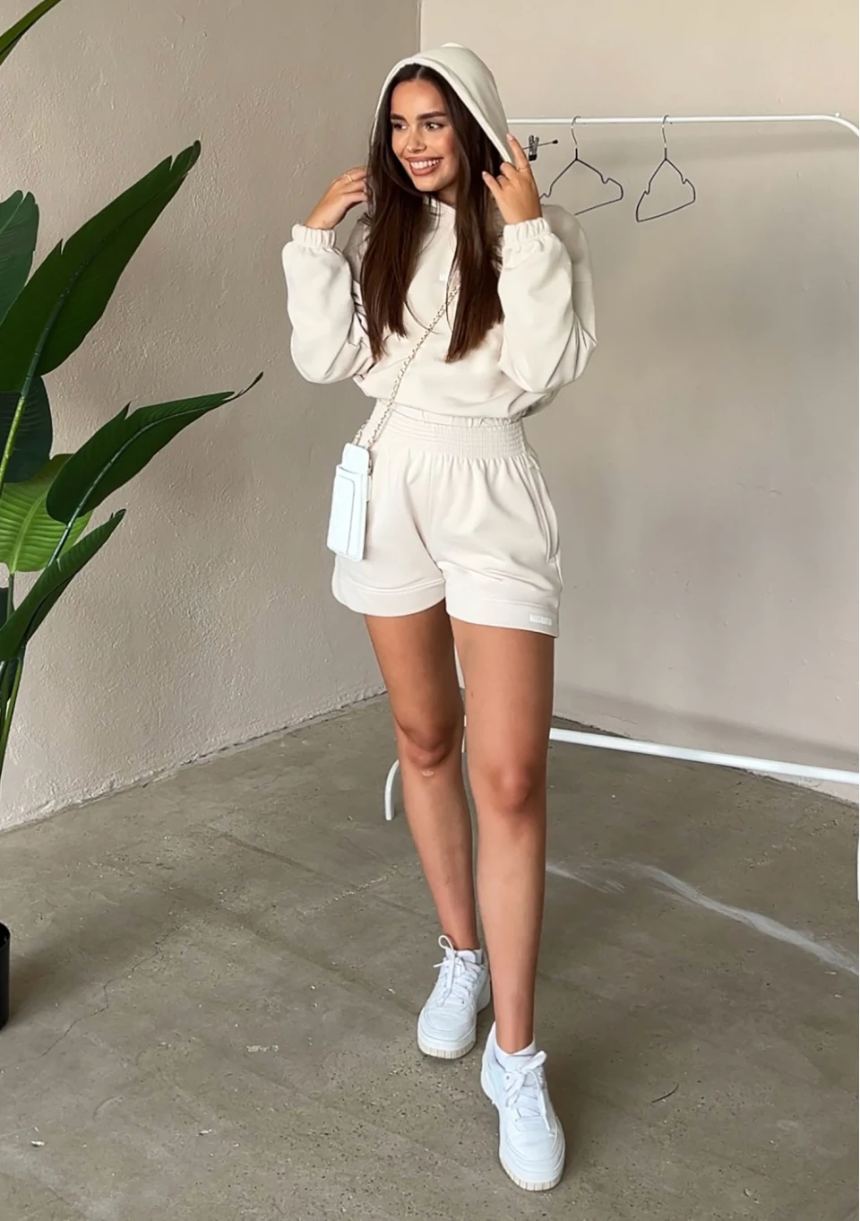 Wygodne i wszechstronne szorty dresowe damskie w delikatnym, kokosowym odcieniu. Spodenki to niezastąpiony element prostych, sportowych stylizacji na wiosnę i lato.