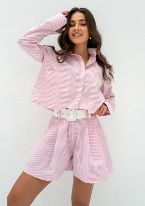 Szorty damskie z rozkloszowanymi nogawkami w różowe prążki to połączenie uroku retro z nowoczesnym stylem. Wykonane z miękkiej, 100% bawełny zapewniającej komfort noszenia przez cały dzień. Ich delikatne różowe paski dodają nuty subtelności i kobiecości do letniej garderoby. Dyskretny, drobny suwak z tyłu gwarantuje łatwe i eleganckie zapięcie. Ten wyjątkowy fason jest idealny na letnie spacery po mieście czy relaksujące popołudnia na tarasie kawiarni. Dostępne wyłącznie w naszym sklepie internetowym, tak jak wszystkie nasze ekskluzywne propozycje na sezon letni.
