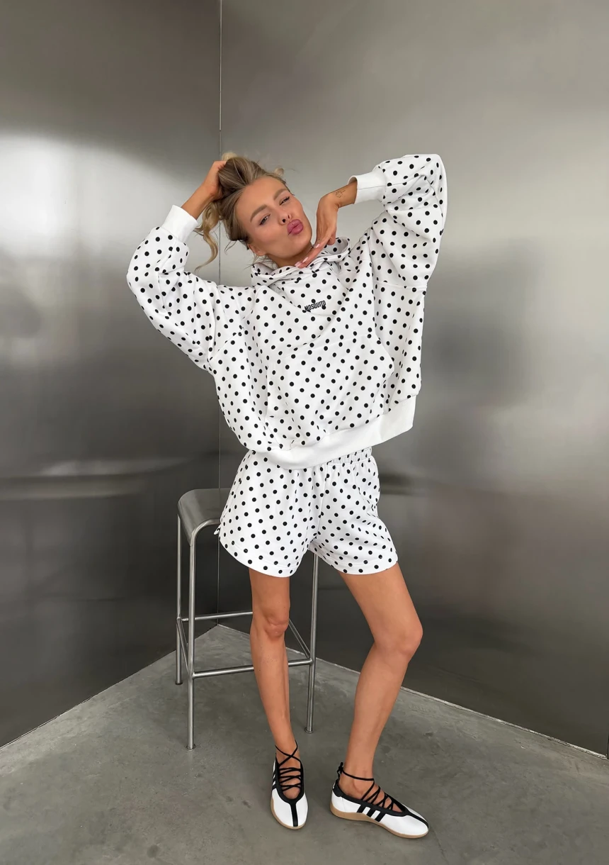 Wzór grochów znów trenduje. W odsłonie wygodnych, codziennych szortów wprowadzą Cię w pozytywny nastrój i beztroski klimat wakacji. Naturalne, miękkie, lekkie wizualnie, jak i w odczuciu! Uszyte w Polsce.