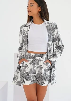 Eleganckie szorty damskie o czarnym wzorze palm świetnie wpisują się klimat lata. Mając taki fason w swojej kolekcji, nie będziesz musiała zastanawiać się długo nad wyborem odpowiednio komfortowej stylizacji w upalne dni. Zwłaszcza, gdy okazja będzie wymagała odrobiny elegancji. To wygodny model z elastyczną gumą, która dopasuje się do talii i nie uciśnie sylwetki ja sztywne fasony z rozporkiem. Dobierając do nich szykowną marynarkę stworzysz stosowny do każdej sytuacji look, w którym jednocześnie poczujesz się lekko i komfortowo.