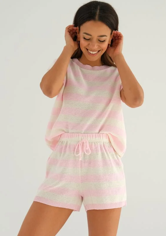 Lekkie szorty damskie w plażowym stylu, urokliwie ozdobione sznureczkami i wzorem różowych pasków. To spodenki idealne na letnie upały, wykonane z drobno dzianej bawełny.