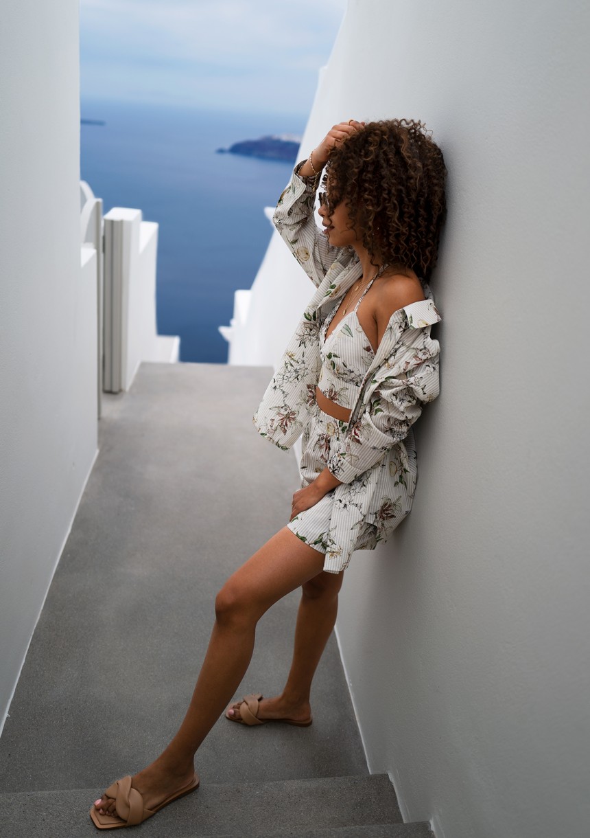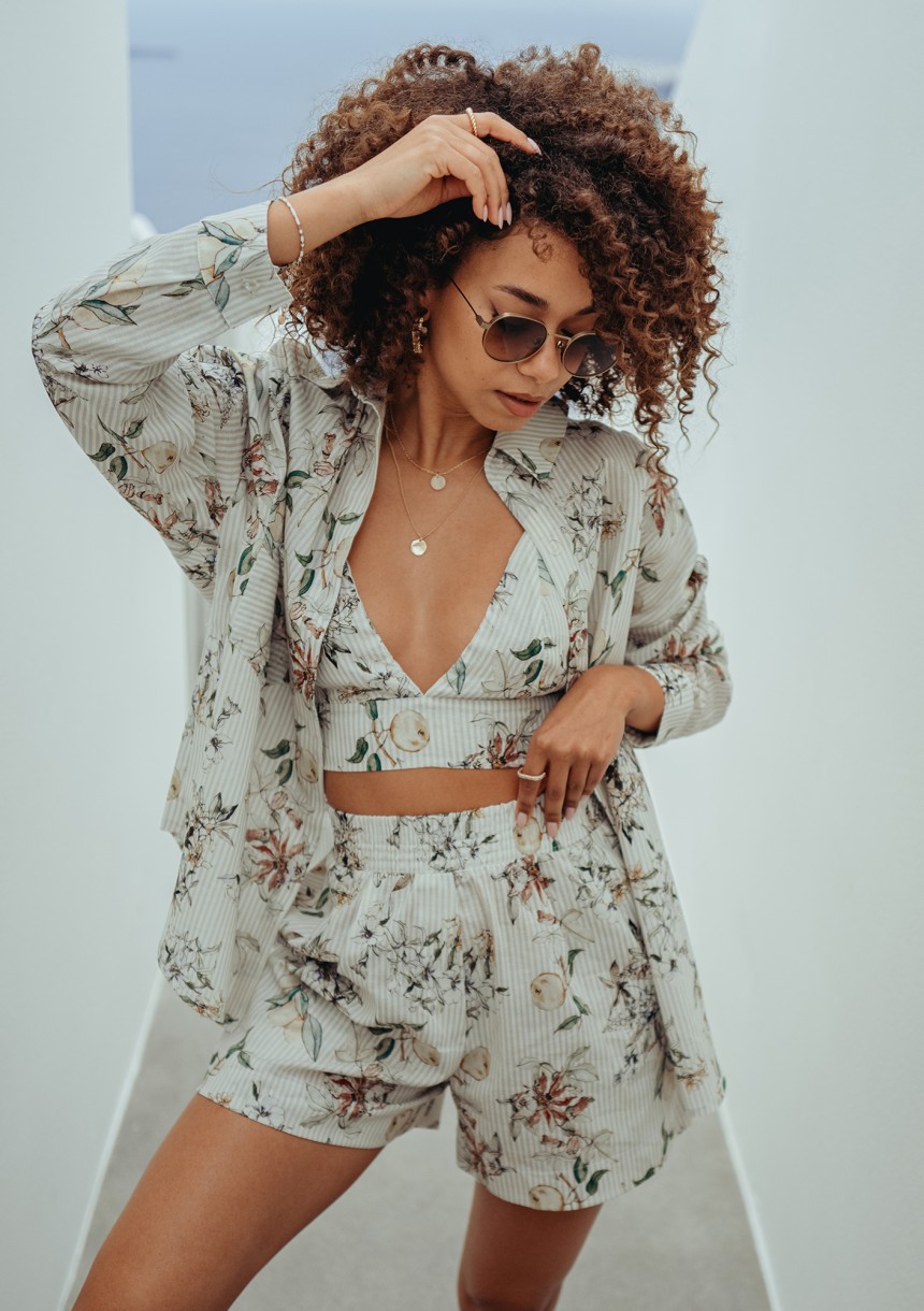 Bawełniane szorty damskie zdobione delikatnym wzorem kwiatów, cytryn i prążków. To element przebojowej stylizacji letniej, którą stworzysz z koszulą i topem.