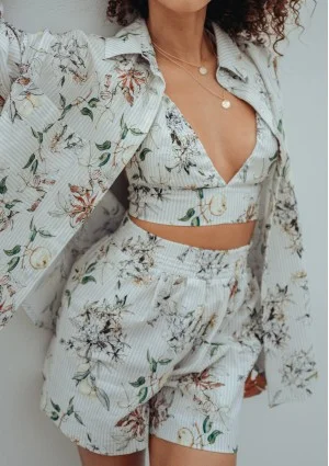 Letnie szorty z bawełny zdobione delikatnym wzorem prążków, kwiatów i cytryn to element przebojowej stylizacji na wakacje. Połącz je z krótkim topem i luźną koszulą o tym samym deseniu. Zaskoczysz bardzo sensualnym wyglądem.