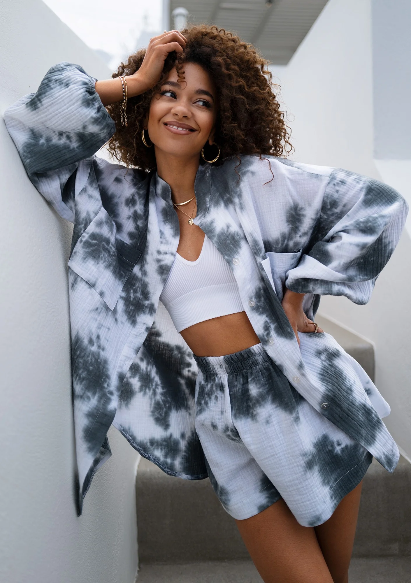Szorty damskie z przewiewnego muślinu to niezbędna pozycja do wakacyjnej walizki. Lekkie, uniwersalne i wygodne - ten fason okaże się Twoim numerem jeden, gdy nadejdą największe upały. W dodatku barwione modną techniką tie dye na szaro dodają więcej luzu i beztroskiego klimatu.