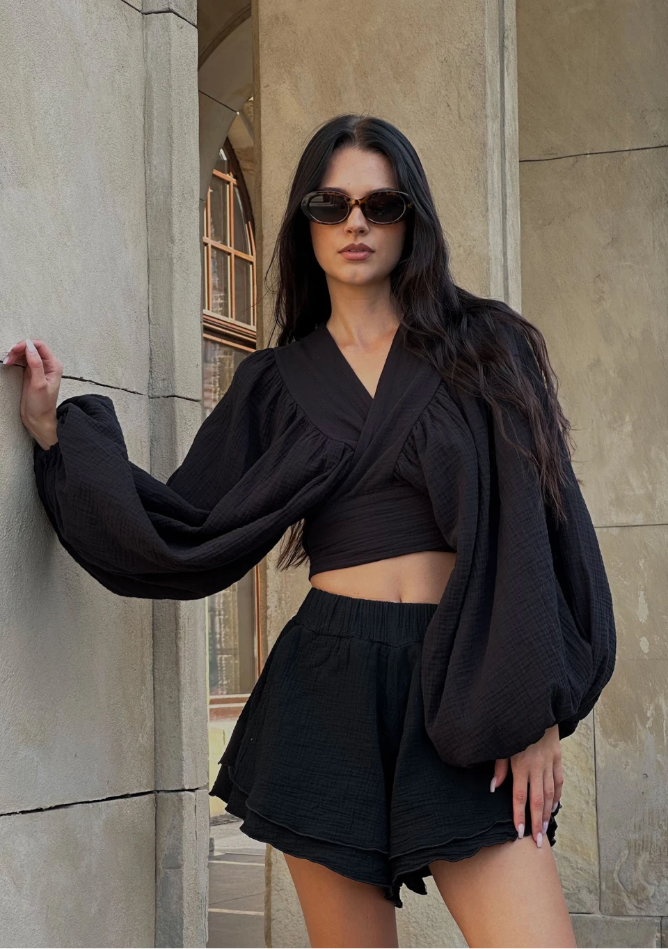 Lato to idealna pora na muślin. W czarnych szortach z falbankami poczujesz się lekko i komfortowo, szczególnie w upały.