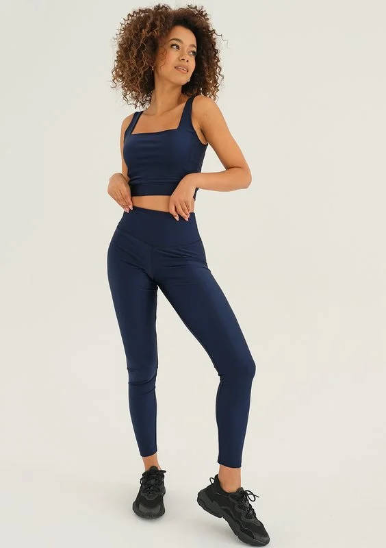 Granatowy top damski na każdy rodzaj treningu, ozdobiony eleganckim, złotym logiem. Model wygodnie podtrzymuje biust oraz pięknie eksponuje ramiona, dekolt i plecy.