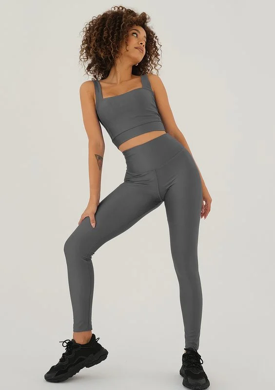 Szary top damski do ćwiczeń pięknie eksponujący górne partie sylwetki. Uszyty z podwójnej, elastycznej tkaniny, wygodnie podtrzymuje biust w trakcie treningu.