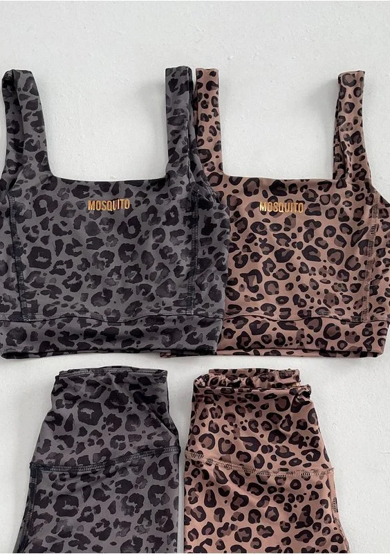 Stylowy top sportowy w panterkę, ozdobiony złotą aplikacją loga. Krój wygodnie dopasowuje się i pięknie eksponuje sylwetkę. Top wykonany z podwójnej, bardzo elastycznej tkaniny.