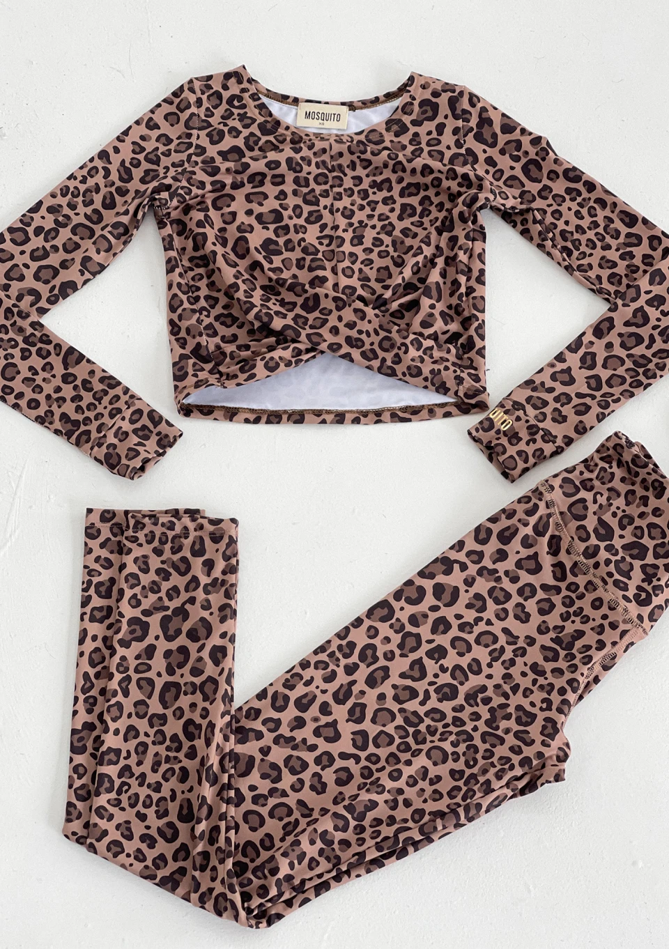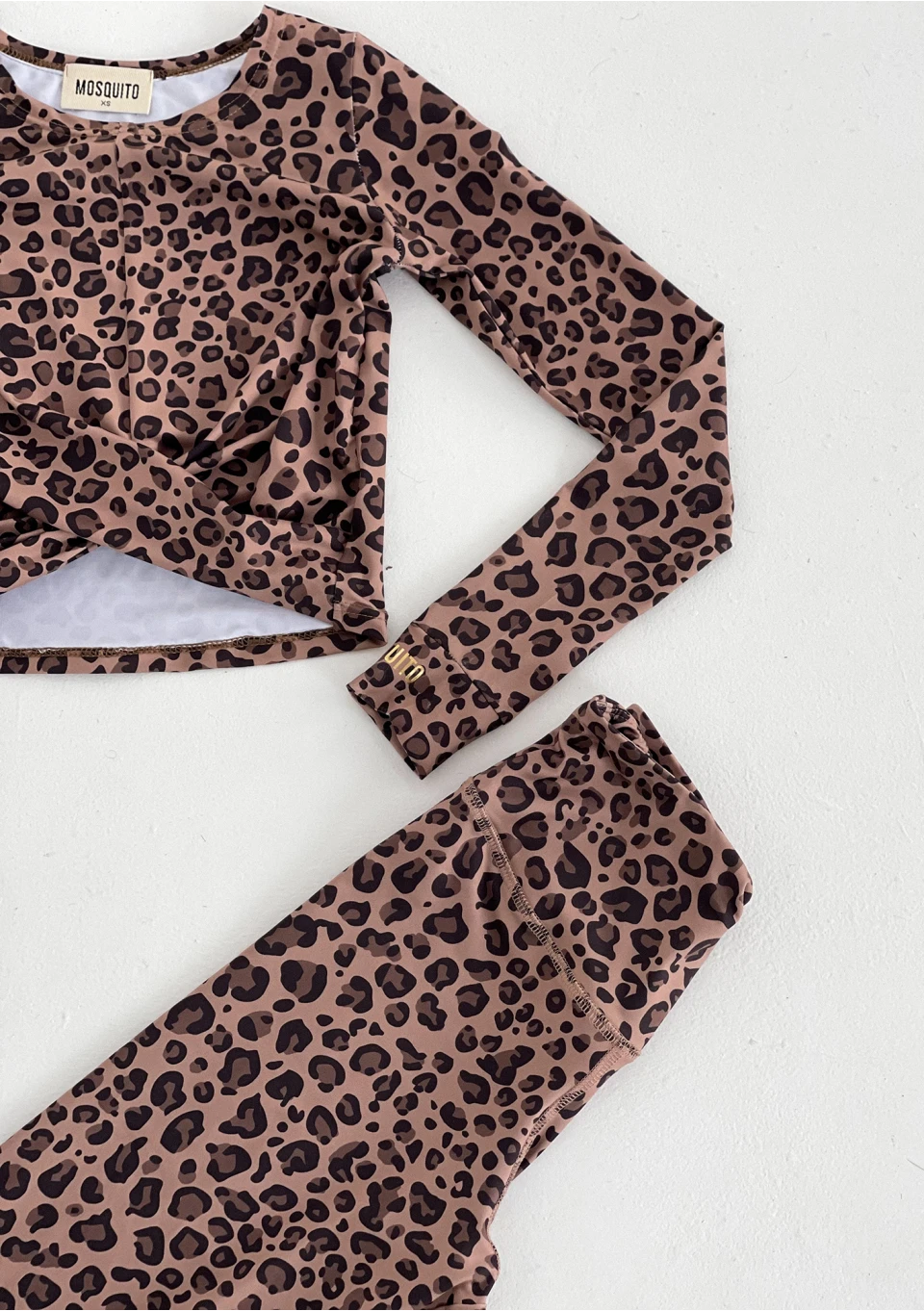 Beżowy top w cętki do ćwiczeń, z elastycznej tkaniny. Model z długim rękawem, pięknie eksponujący talię. Pozwala na wszechstronne, sportowe zastosowanie.