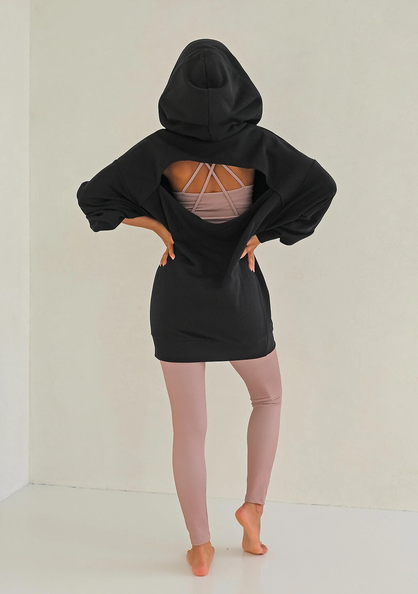 Czarna tunika z pęknięciem na plecach to w rzeczywistości fason z bardzo intrygującym wycięciem i pojemną kieszenią. Stwórz całkiem nową, nietuzinkową stylizację z luźną, sportową tuniką, która nawiązuje wyglądem do bluz w typie oversize. Tunika sięga długością za pupę, więc będzie genialnie prezentować się z legginsami lub obcisłymi spodniami. Efektowne wycięcie na łopatkach przełamuje minimalizm luźnego kroju i klasycznej czerni ubrania. Tunika okaże się szczególnie trafionym wyborem, gdy lubisz nosić bluzki o ciekawych krojach ramiączek na plecach – produkt doskonale wyeksponuje wszelkie, tylne zdobienia. Duża, pojedyncza kieszeń jest nie tylko funkcjonalnym i wygodnym dodatkiem, lecz również podkreśla sportowy, lekki styl tuniki.