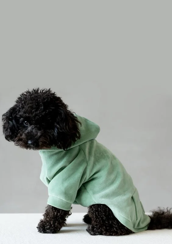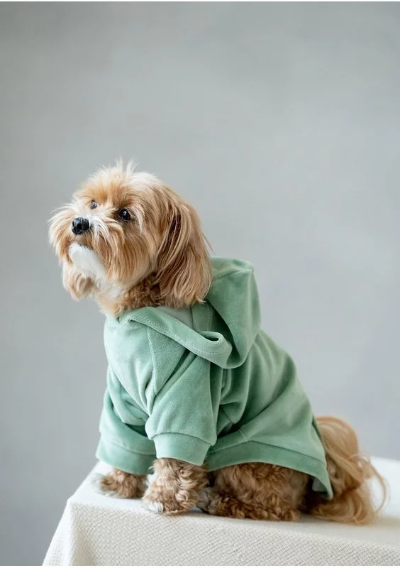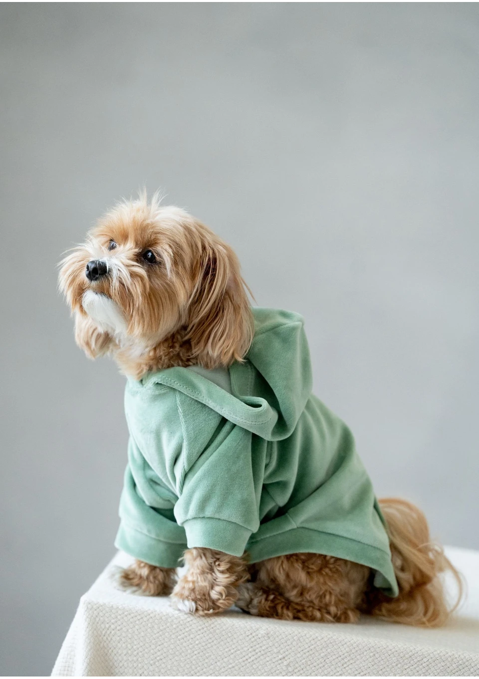 Welurowa bluza dla piesków w kolorze pastelowej mięty. Fason optymalnie skrojony na sylwetki mniejszych ras, zapewni im wygodę, poczucie swobody i miłego ciepła. Ubranko ozdabia kieszonka z logiem i praktyczny kaptur.