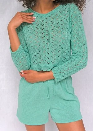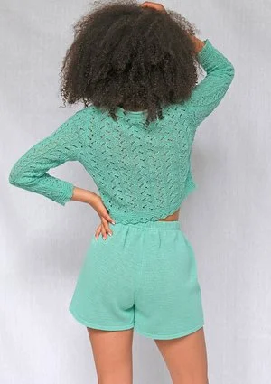 Latem niezwykle trudno zadbać o wyposażenie swojej garderoby w odzież praktyczną i atrakcyjną jednocześnie. Spodnie damskie na tę porę roku powinny być bowiem odpowiednio przewiewne, aby pozwalały skórze oddychać. Doskonałym rozwiązaniem, które pozwoli połączyć tą funkcjonalność z efektownym wyglądem jest wybór szortów dzianych. Luźniejszy splot sprawia, że produkt doskonale przepuszcza powietrze i umożliwia mu swobodną cyrkulację. Dzięki temu spodenki dbają o zapewnienie swojej właścicielce idealnego komfortu cieplnego, a dodatkowo świetnie się prezentują. Szorty mają luźny fason, który nie uciska nóg i optycznie je wyszczupla. Zastosowanie ściągacza w postaci sznureczka sprawia, że spodenki utrzymują się na swoim miejscu i nie zsuwają, dbając o pełną wygodę. Ich atutem jest także piękny, miętowy kolor, który podkreśla letnią opaleniznę.