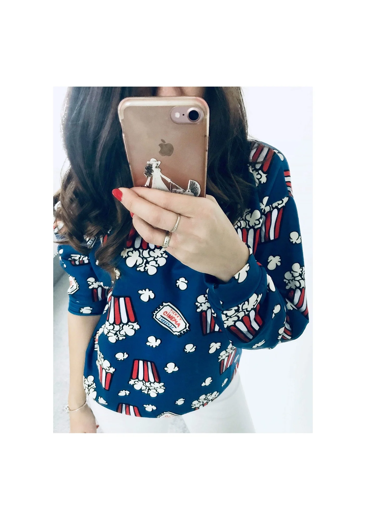 W Mosquito chętnie łączymy klasyczne kroje ubrań z nietypowym wzornictwem. Efektem tego zabiegu jest oryginalna bluza damska z motywem w popcorn! Grafika doskonale odzwierciedla pełen energii charakter swojej właścicielki, a intensywny kolor wyróżnia ją na chodniku. Print w popcorn cechuje się dużą dynamiką, a dzięki swoim właściwościom przez długi czas wygląda jak nowy. Utrzymana w niebieskiej kolorystyce tkanina dobrze zachowuje się podczas prania, nie traci swoich barw, ani pierwotnych kształtów. Jedyna w swoim rodzaju damska bluza dresowa dostępna jest w naszym sklepie w rozmiarach XXS – XL.